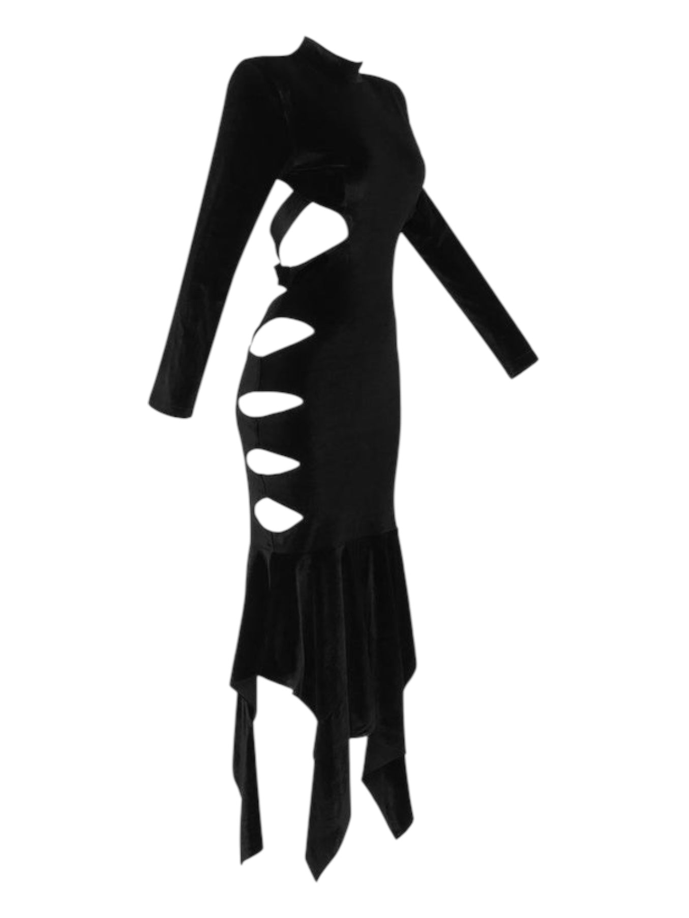 Abito midi in velluto con cutouts a taglio vivo laterali, scollo posteriore con tagli, spalline imbottite, maniche lunghe, chisura con 3 bottoni posteriore. Balze sull’orlo. La modella veste una taglia S ed è alta 160 cm. Veste regolare, scegli la tua taglia.
