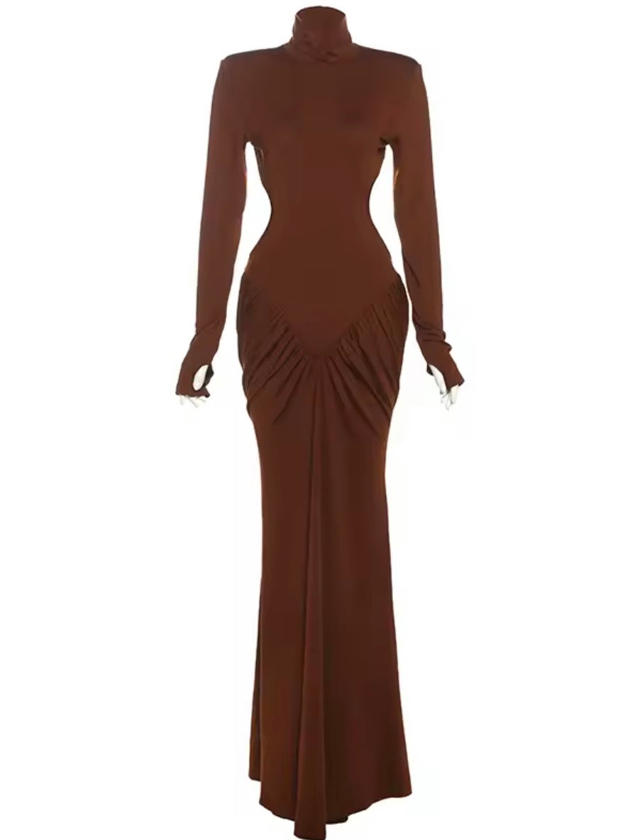 Abito lungo con scollatura posteriore, collo alto, maniche a guanto . La modella veste una taglia S ed è alta 160 cm. Veste regolare, scegli la tua taglia.