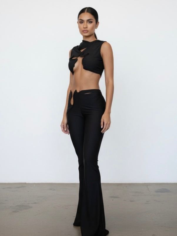 Set nero, con scollatura regolabile. Top e pantalone/gonna. La modella veste una taglia S ed è alta 175 cm. Veste regolare, scegli la tua taglia.
