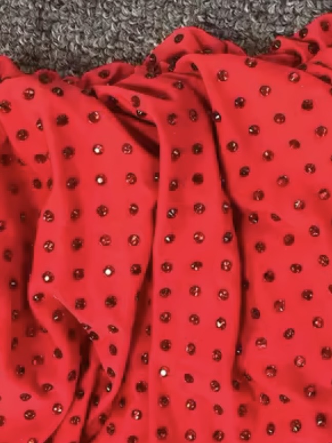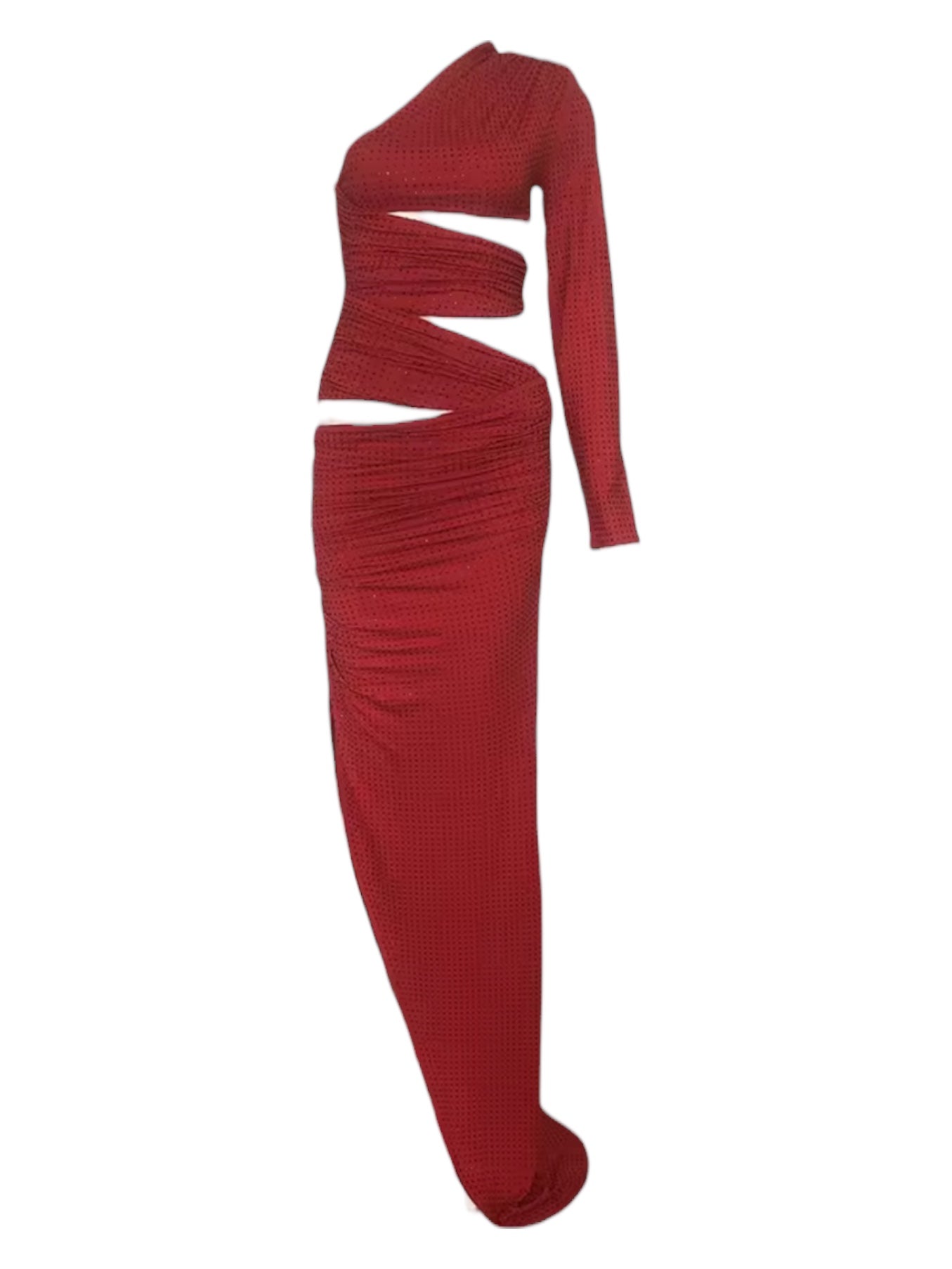 Abito rosso monospalla con strass. Veste regolare, scegli la tua taglia.