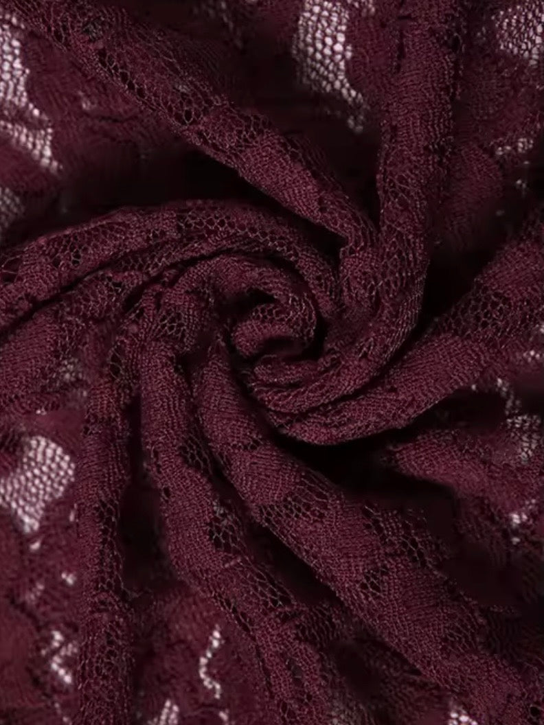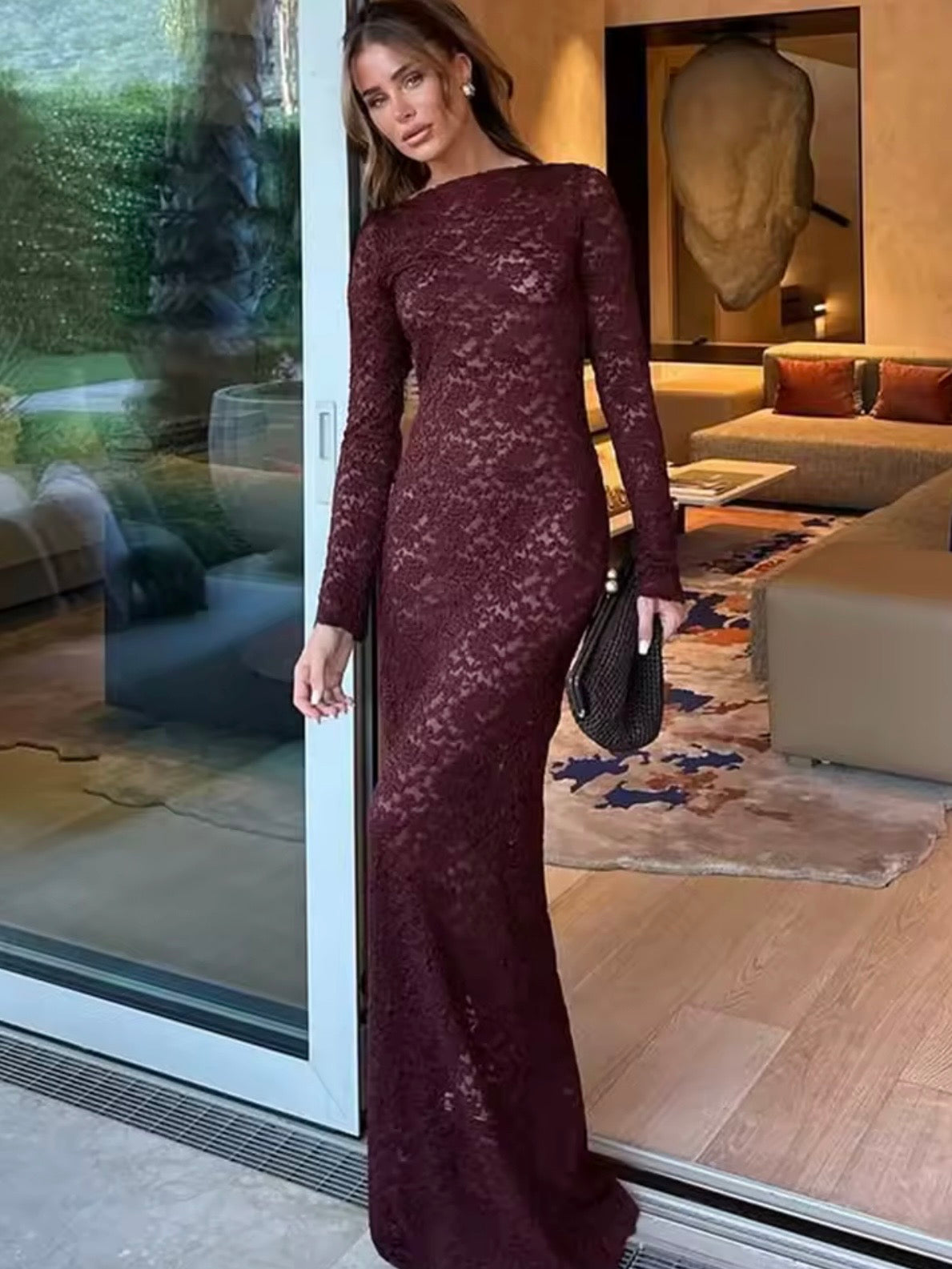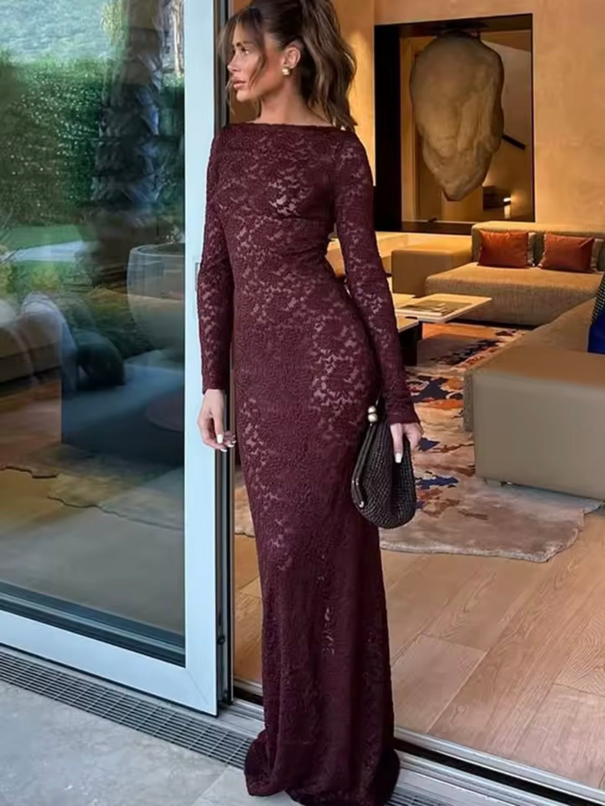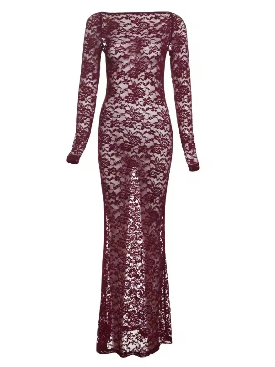 Maxi dress bordeaux in pizzo, maniche lunghe in tessuto mesh.