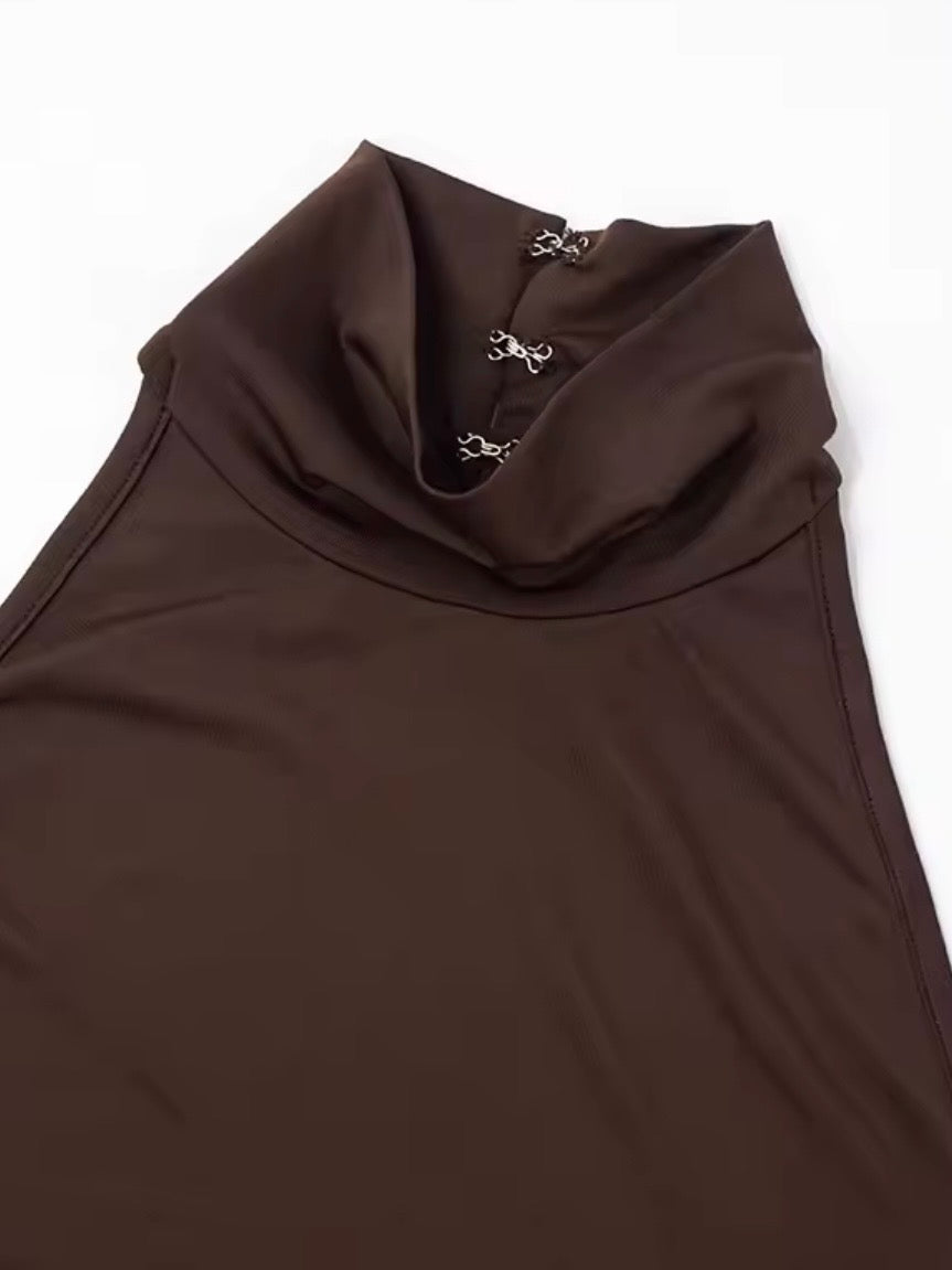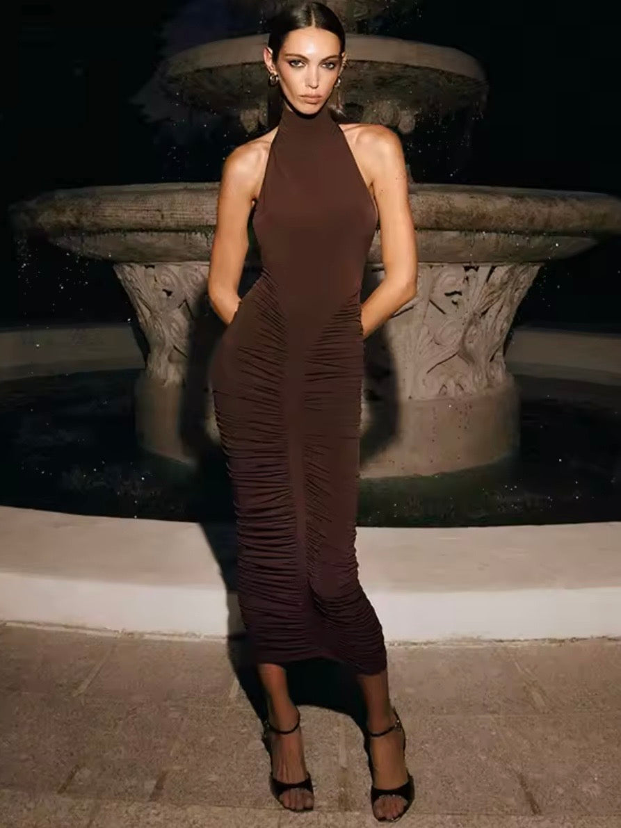 Abito lungo con drappeggio posteriore e scollatura. La modella veste una taglia S ed è alta 160 cm. Veste regolare, scegli la tua taglia.