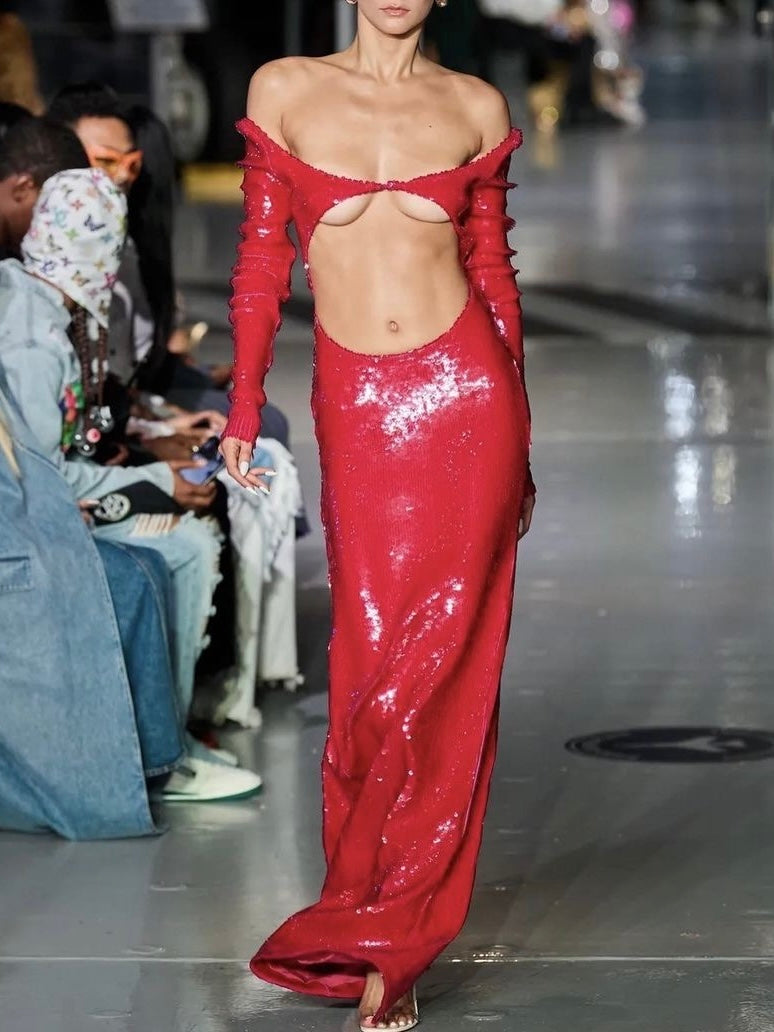 Maxi dress rosso di paillettes, scollatura sul davanti, chiusura posteriore con zip invisibile e laccetti. Maniche lunghe, aderente. La modella veste una taglia S ed è alta 176 cm. Veste regolare, scegli la tua taglia.