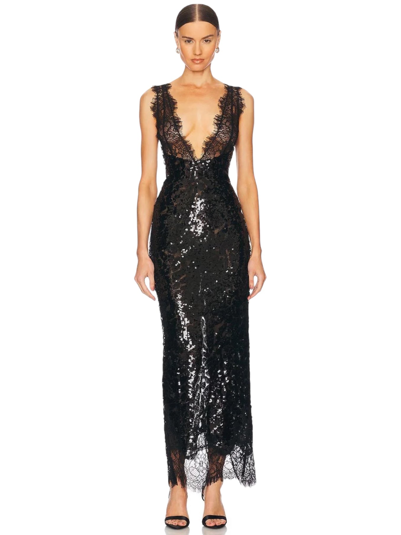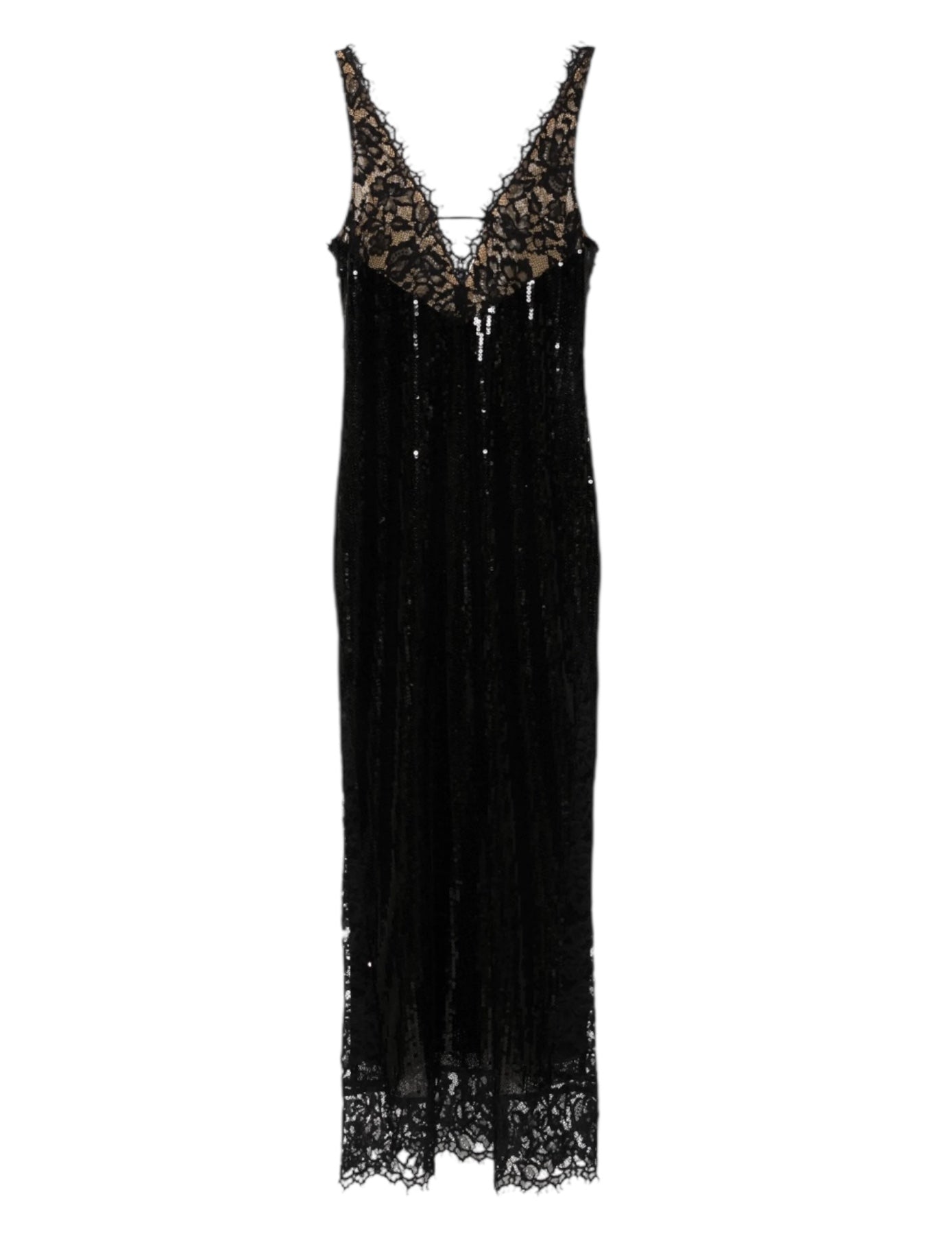 Abito nero di paillettes e pizzo. Veste regolare, scegli la tua taglia.