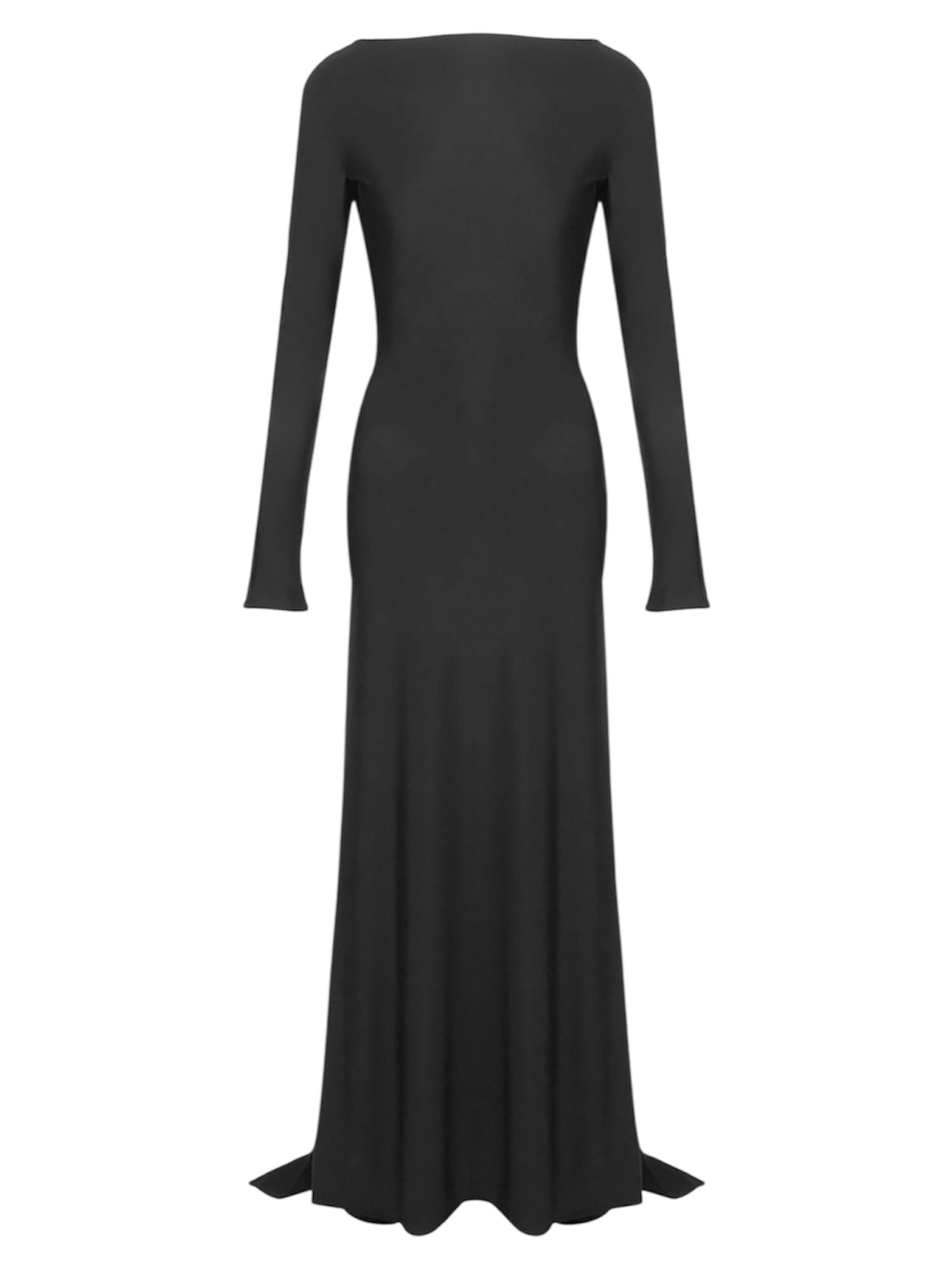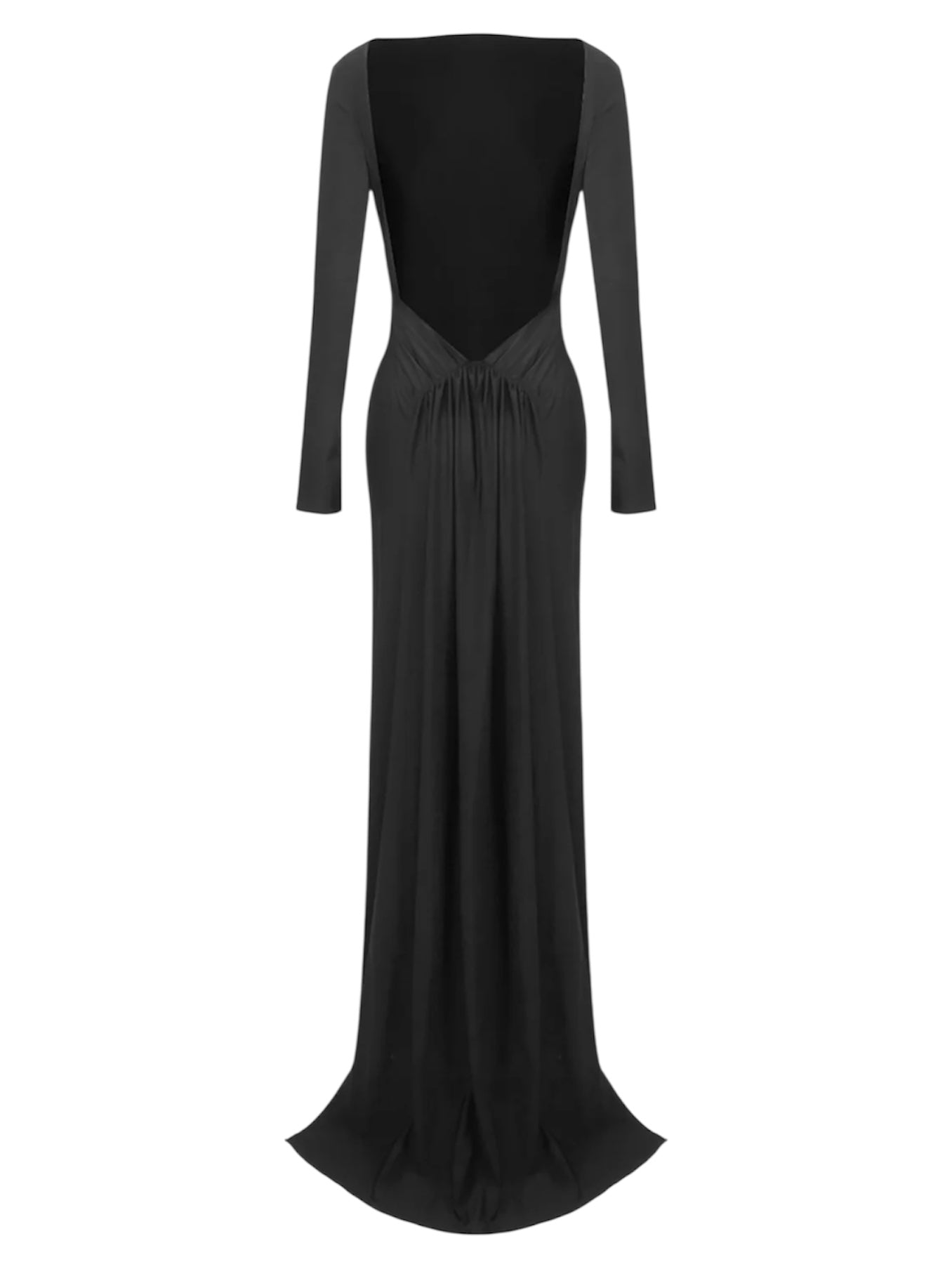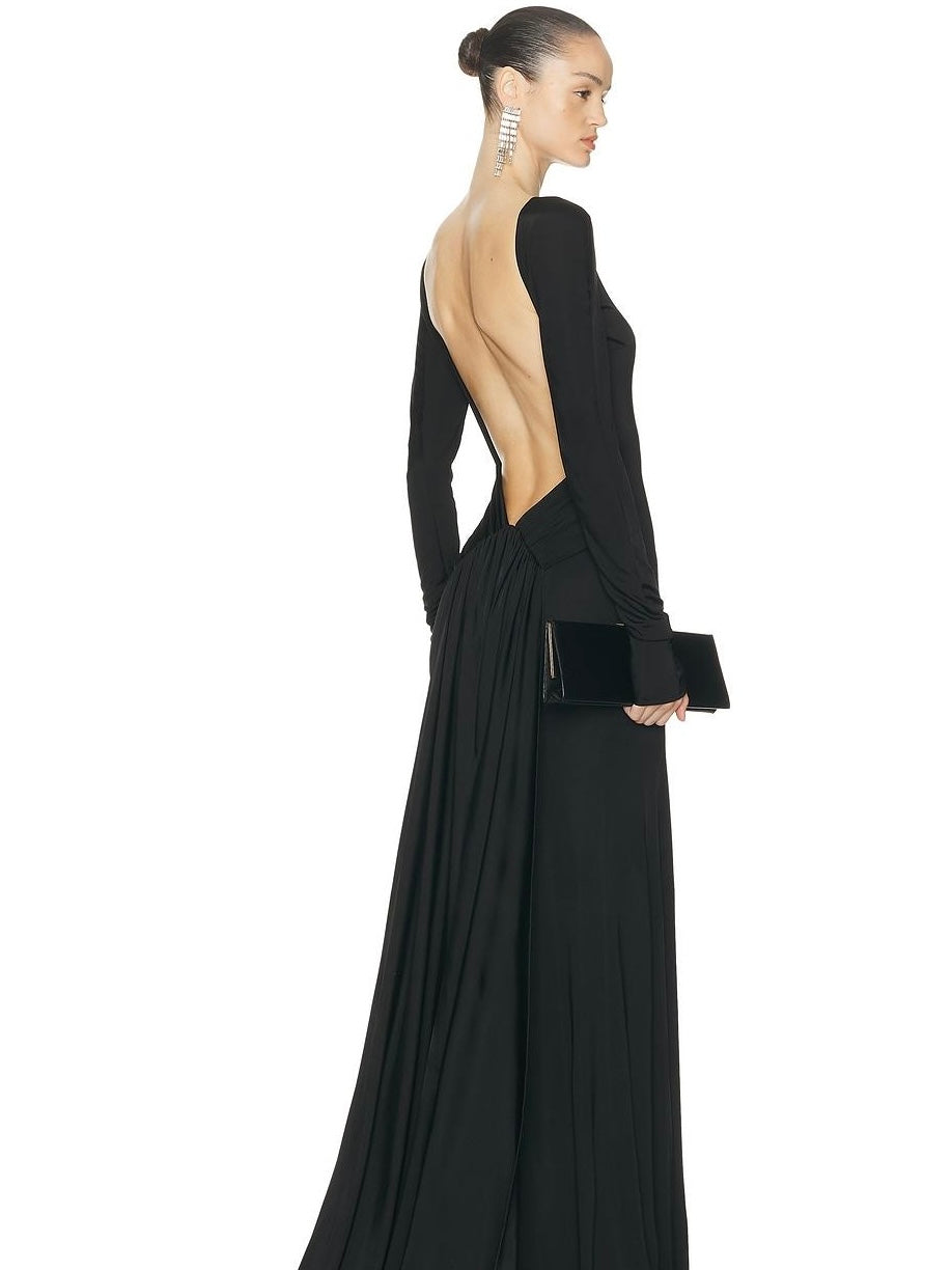 Maxi dress nero con maniche lunghe, scollatura posteriore profonda con fascia pendente. Veste regolare, scegli la tua taglia.