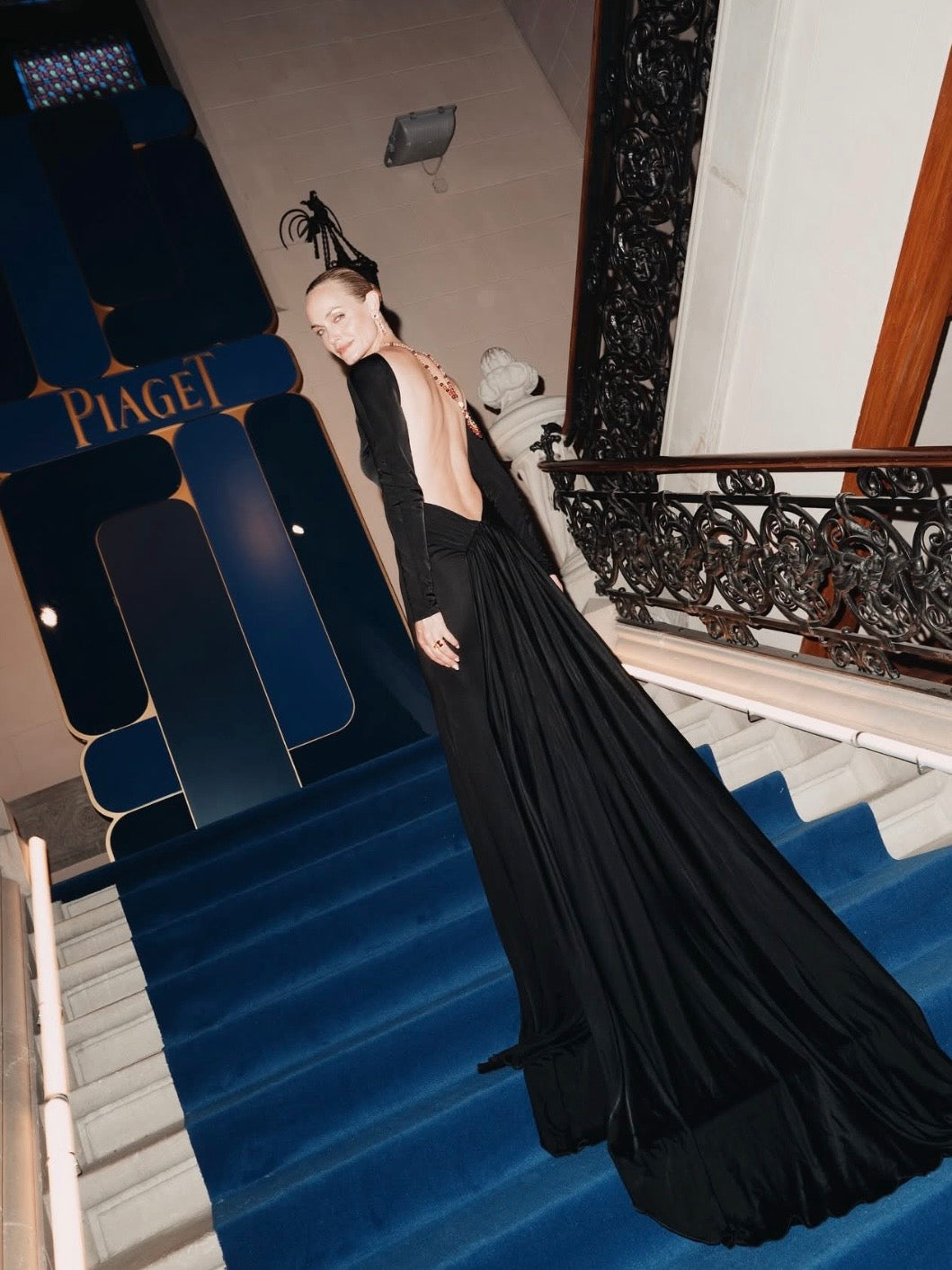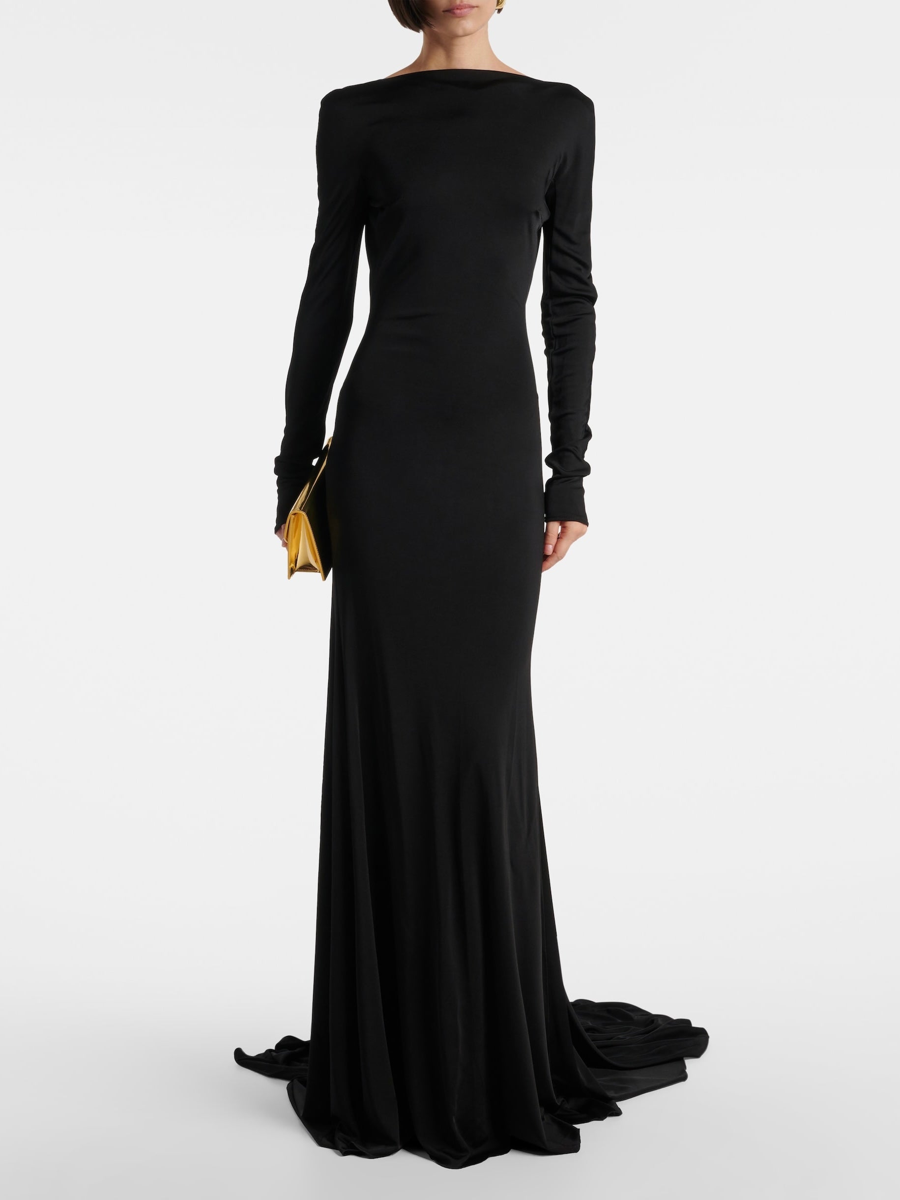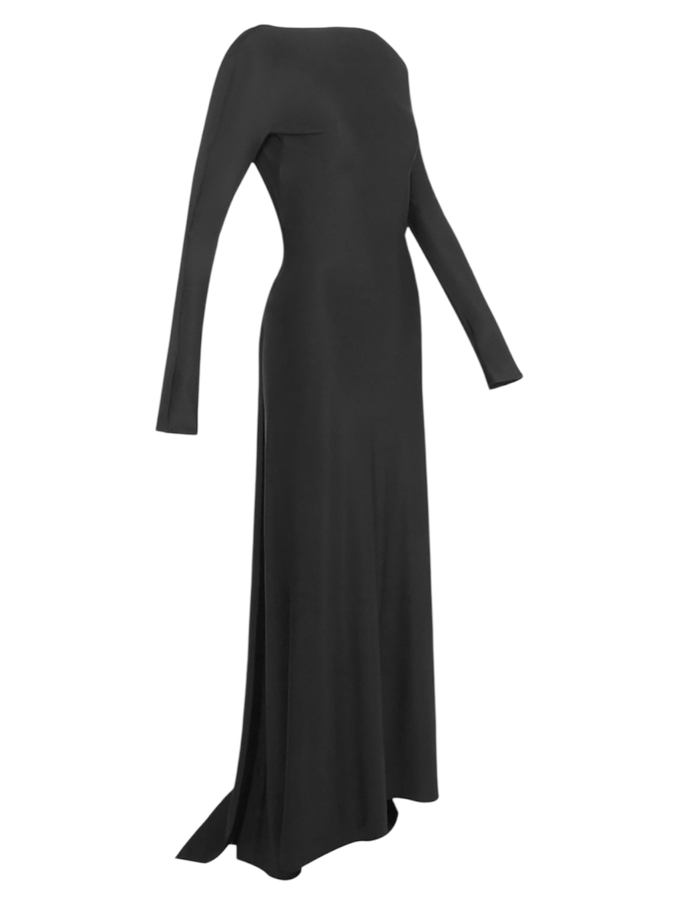 Maxi dress nero con maniche lunghe, scollatura posteriore profonda con fascia pendente. Veste regolare, scegli la tua taglia.